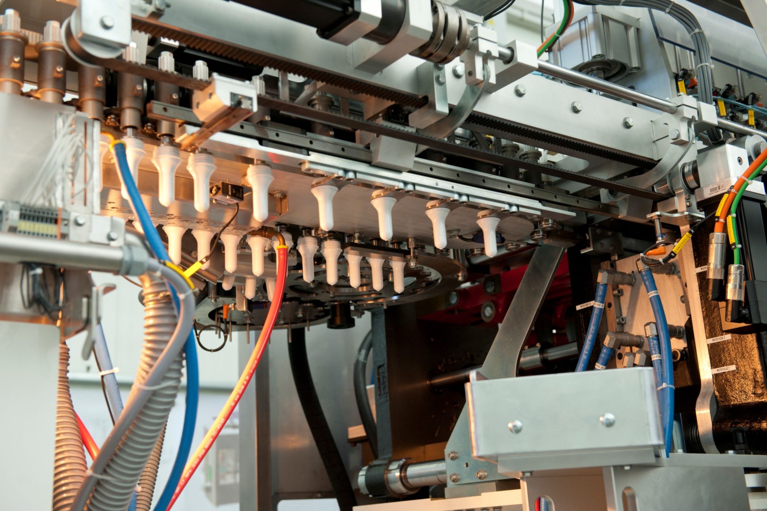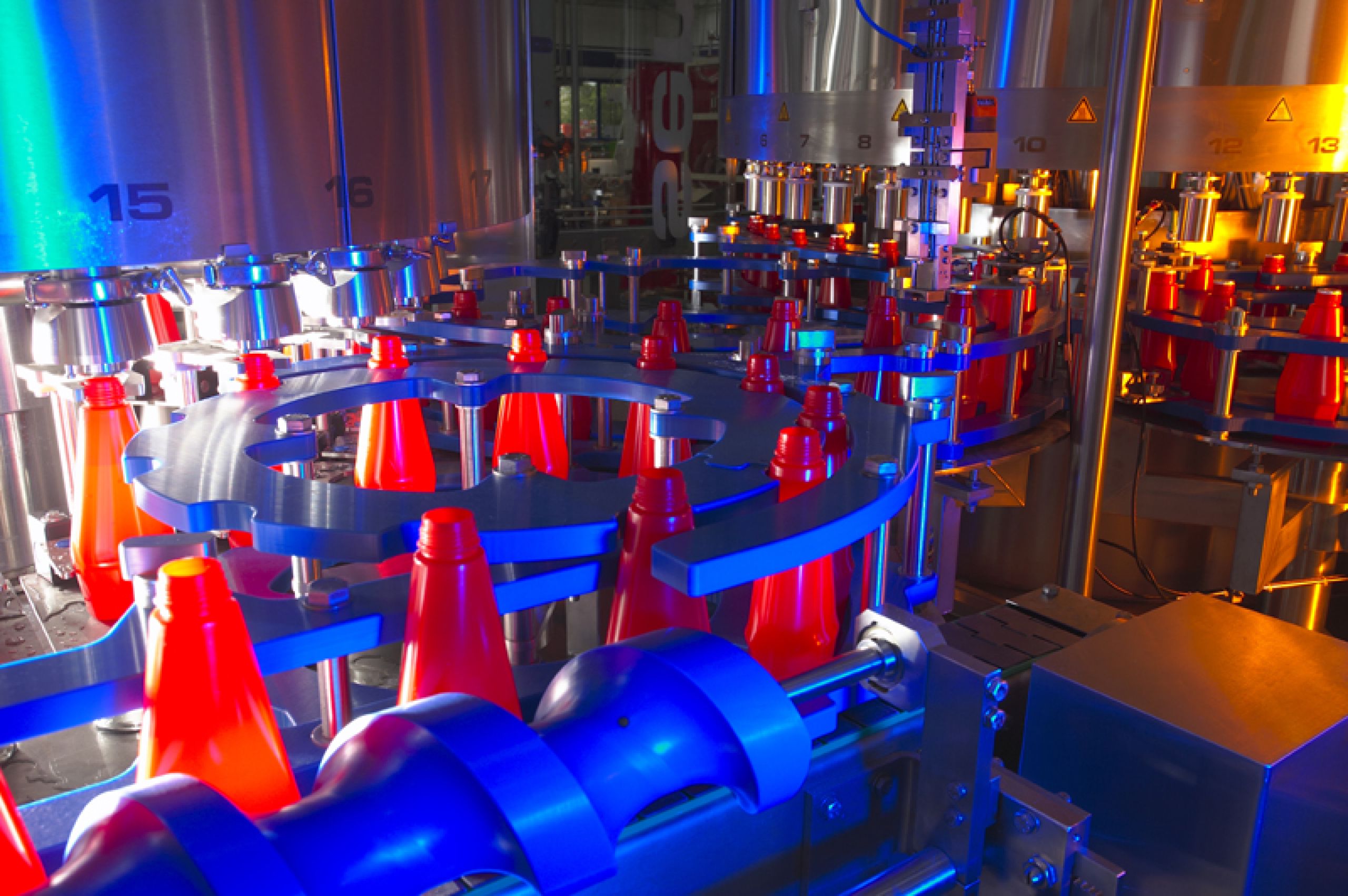 Bei der neuen Anlage wird das PET-Streckblasverfahren in eine Blocklösung integriert. Diese wurde speziell entwickelt, um sich an die hauseigenen Lösungen zur Gewichtsdosierung auf Rotationsmaschinen anzupassen. Dabei synchronisiert das patentierte Blasform-/Füll-/Verschließsystem den Übergang vom sequenziellen Takt der Streckblasanlage zum kontinuierlichen Fluss der rotierenden Füllmaschine.