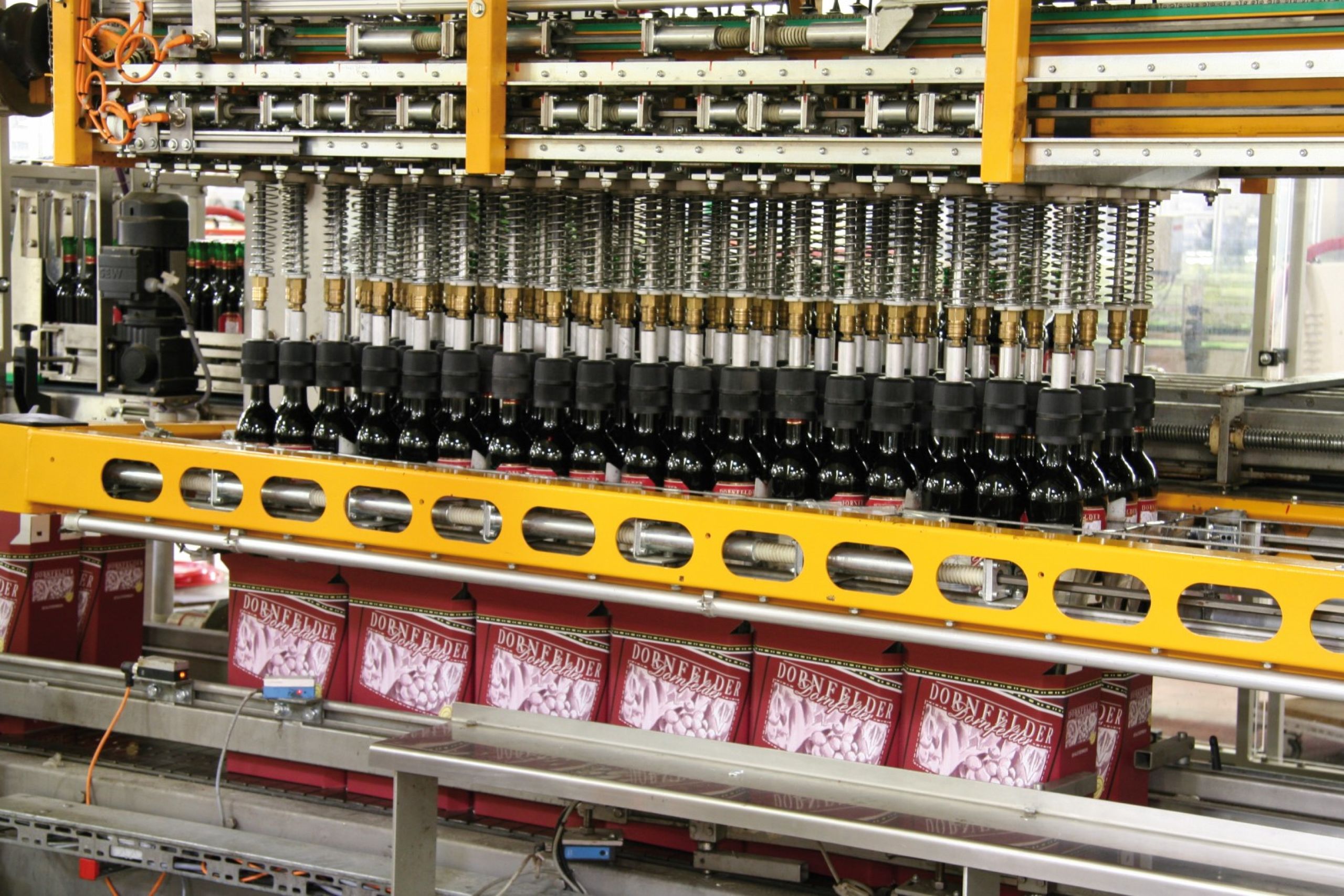 Bei Erreichen der Lagenpositionen wird der Kopf und zugleich der Zentrierrahmen geschlossen. Das Abschieben kann in gewohnter Weise beginnen. Durch das kontinuierliche Zentrieren der Lage wird ein Herabfallen der Flaschen verhindert.